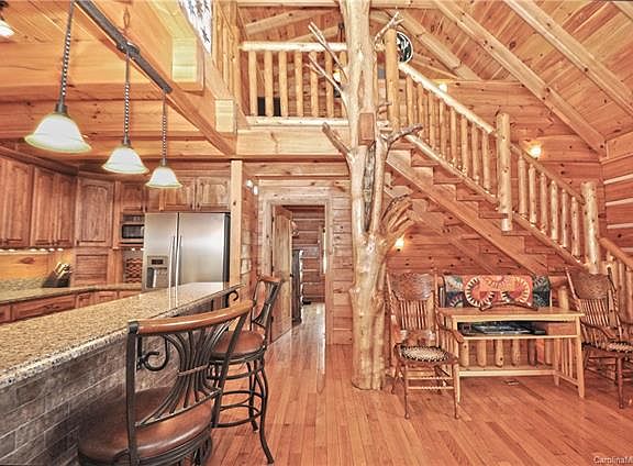Awe inspiring long range mountain views from this handcrafted log home on 3.4 acres. Quality workmanship, Spacious Great Room, Open Living Space, Cathedral Beamed Ceilings. Chef's Kitchen, Custom Hickory Cabinets and Granite Counters, Stainless Steel Appliances. Master BR Suite w/ bath on main level. Guest Suite on lower level w/ private bath, Kitchenette and Den. 2nd floor has Loft/Office and Private Bedroom Suite w/bath. Covered porch, open Deck with SPECTACULAR mountain views! Gazebo, Hot Tub & Firepit. Fruit trees, berries and grape vines. Fenced pasture for goats and chickens. Whole house generator. This is the complete package! Come and enjoy the lifestyle in the mountains!