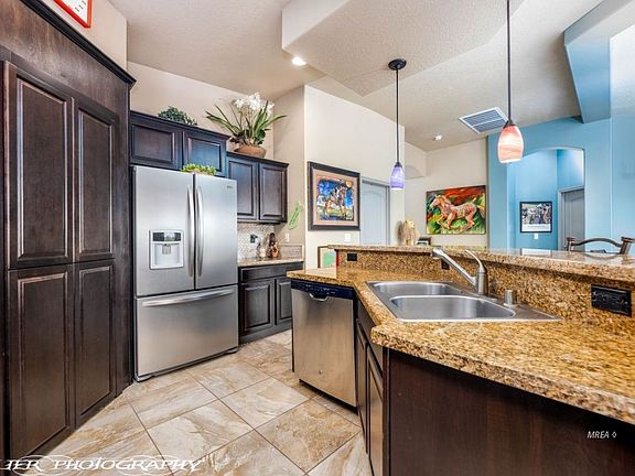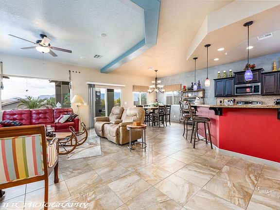 As you enter this 1718 sq. ft. home, your eyes will immediately be drawn to the natural lighting and views from the back of the home. The headline says it all. Outdoor living at it's best....extended covered patio, built in BBQ, bar, a putting green, and did I mention how spectacular the mountain views are!! This is exactly where you'll want to be when your not enjoying the beauty on the inside of this home. Special attention has been given to the kitchen that has stainless steel appliances, glass back splash, granite kitchen counters, and a hidden pantry. The kitchen opens up to the great room and dining area, with detail given to the coffer ceilings. No worries about having enough room for company, because this home has 3 bedrooms and 2 full baths. A three car garage and separate laundry room help to round out this awesome abode. This well sought after neighborhood is zoned for short term rental and has low HOA fees. Bring your clients through today....this one of a kind will not last long.