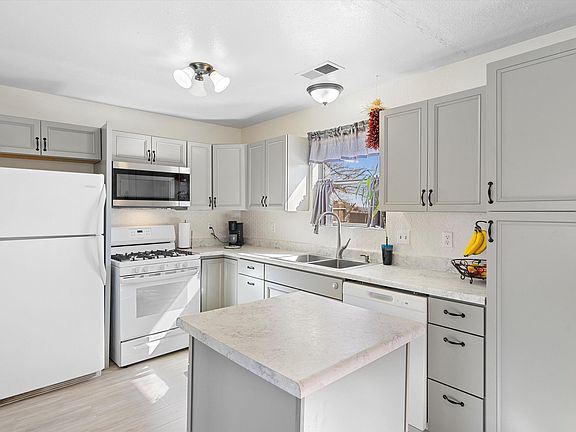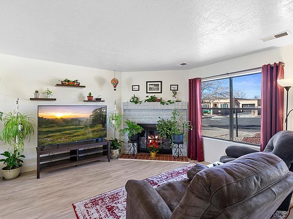 Come by and see this charming single level home situated on a spacious cul-de-sac lot in sunny Rio Rancho! New 3 ton AC/ Furnace installed 2022! Boasting 3 beds, 2 full baths, and a 1-car garage, this cozy abode features a living room adorned with vinyl flooring and a wood-burning fireplace, perfect for chilly evenings. The kitchen was updated in 2022 with light and bright soft gray cabinets, countertops and a mini island for convenience. Retreat to the generously sized master suite with a full bath, providing a peaceful sanctuary after a long day. Outside, the beautifully xeriscaped front yard welcomes you home, while the extra-large backyard offers grass and tiered areas, complete with large shade trees, an open patio area, and additional storage shed!