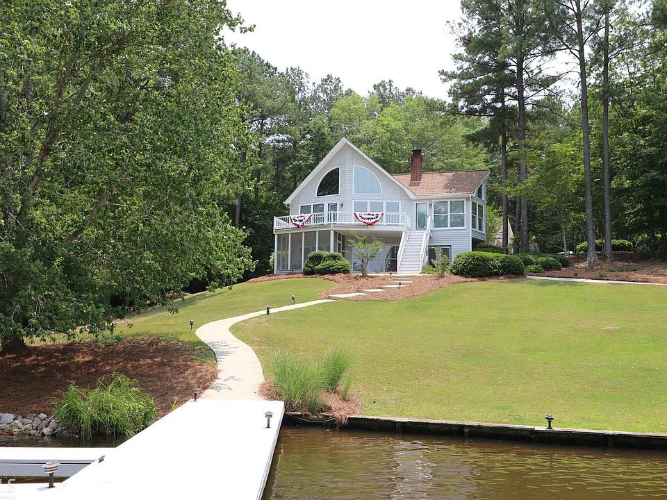 This home is one-of-a-kind. Very private land. Fenced in front. Located on 3+ acares of land and 383' of waterfrontage. Home has 4 bdrms & 4 1/2 baths. plenty of room for guests. Sun-room on main level leaves in bright sunshine to enjoy morning coffee.Stainless Steel Appliances in Kitchen. Fireplace on both levels. Lower level has large family room w/wet bar and kitchen. Large covered entertaining area,screened in just in case of rain. Separate garage for storage. Even has a gigatic fire pit for a pig roast. Sand beach area for the kids. Maxi Brock dock with boat lift and jet ski lift. Lot located on left of home is a waterfront lot that could be sold. Located in one of the most sought after subdivisions on Lake Oconee/Beautiful water.REAL VALUE