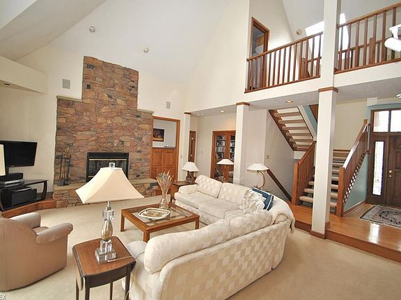 This custom built home has been maintained beautifully inside & out! Thoughtful design enhances the stunning views of nature & woods from every window. The circular drive leads to a welcoming front door with side lights and transom windows. Upon entering the dramatic great room has soaring ceilings, stone fireplace, skylights, leaded glass circle top window and doors leading to an expansive deck. The well-equipped kitchen features ceramic tile floors, ample counters, cherry cabinets and a light filled eating area with views of the woods. French doors lead to a library with built-in bookshelves. The private first floor master suite boasts a tent ceiling with fan and sliders to a private slate patio. The master bath incudes a walk-in closet, built-ins, cherry cabinets, double vanity, whirlpool tub, separate shower and door to the deck. The first floor laundry has ample cabinets & closet. The charming guest bath with pedestal sink and decorative mirror completing the first floor. The second floor affords dramatic views of the great room below and includes a huge walk-in storage closet. One bedroom has an ensuite bath and two additional bedrooms share a jack and jill bath. The walk-out lower level has tons of natural light and is a perfect spot for a studio. The lower level includes space for an office plus a rec room, hot tub room, half bath and workshop room. There is an attached 3 car garage with stairs to basement, and separate shed for outdoor storage space.