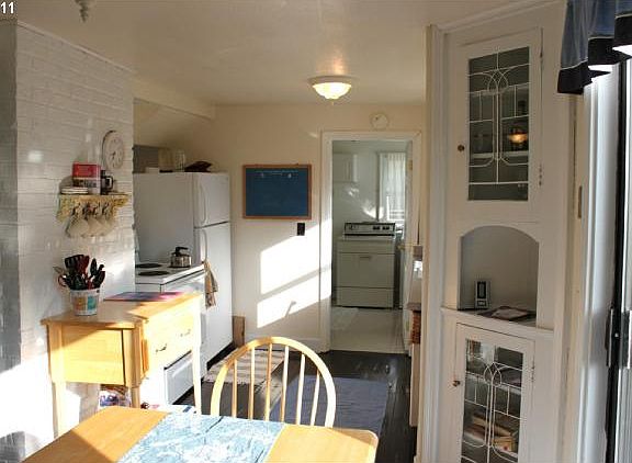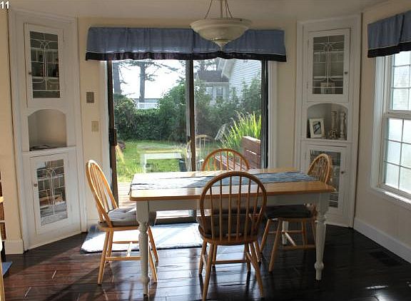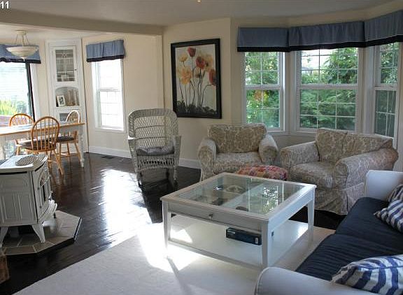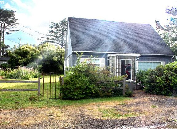 QUAINT & PICTURESQUE cottage by the sea. Oceanview from box seats in upper level dormer windows - so inviting. Beautiful thick plank dark stained handscraped hardwood floor. Leaded glass china cabinets, enameled pellet stove, porch, deck, large yard. Entry level bdrm & half bath. Double lot may be dividable. Just 2 blocks to beach & downtown Oceanside village.