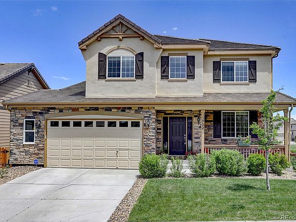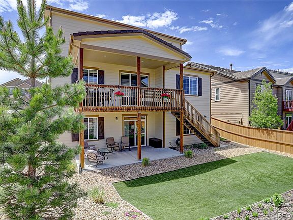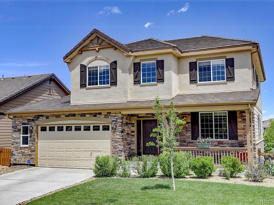 LIVE SHOWINGS AVAILABLE & 360° VIRTUAL TOUR FOR IMMEDIATE VIEWING! Richmond American, 2-Story, Andrew model with stucco & stone exterior is located on a corner lot in the Badger Gulch/Meridian Village neighborhood of western Parker. Hardwood floors greet your feet in the Foyer, while double height ceilings make for an open & inviting entry. Take the stairs from the Foyer to the upper level, or continue on hardwood floors past the Office and Dining Room to the gourmet Kitchen, complete w/ granite countertops, island, and stainless steel appliances, including double ovens & a gas cooktop. There is plenty of space for a dining table in the kitchen, or open the 3-panel sliding glass door to the covered deck for outdoor dining. The spacious Living Room is directly off the Kitchen & features carpeted floors, decorative ceiling fan, built-in surround sound system, and gas fireplace w/ stone hearth & painted wood mantle. 9' ceilings throughout the main level. A powder bathroom completes the main level. The upper level holds all 4 bedrooms, including the Master Bedroom w/ tray ceiling & en-suite 5-piece Master Bathroom w/ tile floors, granite countertops, soaking tub & shower stall w/ tile surrounds, and spacious walk-in closet. Carpeted floors in all bedrooms. The auxiliary bedrooms share a 4-piece full bathroom w/ dual sinks & Corian countertops. The Laundry Room w/ tile floors, built-in cabinetry, and LG True Balance/Steam HE washer & dryer completes the upper level. The unfinished, walk-out basement is full of natural light & is an extremely flexible space. Use it for storage, or finish to your liking. The covered front porch, covered deck, and covered patio are all great outdoor spaces. Low-maintenance exterior w/ xeriscaping and AstroTurf in the fenced backyard. The 3-car tandem garage is oversized, dry-walled, insulated, and can be used as a 2-car garage w/ extra flex space for storage or workshop. quick access to light rail, DTD, I-25, & E470. WELCOME HOME!