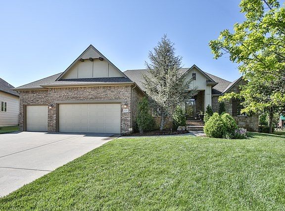 Immaculate & very well maintained 5BR 4BA custom built brick ranch with over 3,800 sf of living space. Great curb appeal. Covered front porch. Tile Entry. High ceilings, wood blinds & crown molding thru out the main level. Formal dining room with crown molding & wood floors. Formal living room with wood floors, crown molding & lots of natural light. Amazing custom granite kitchen includes breakfast bar, stainless steel appliances (5 burner gas stove), wood floors, walk-in pantry, large eating space with bay window and door leading out to covered deck and wonderful Hearth room with wood floors, gas fireplace & lots of natural light. Main floor laundry in separate room. This home features 2 full baths on the main level, and 2 full baths in basement. Master Bedroom features cove ceilings, door to covered deck & large master bath with granite counter tops, double sinks, separate tub & shower, huge walk-in closet. Full finished view-out/walk-out basement includes a spacious family room with brick fireplace (gas), built-in entertainment center, granite 2 tier wet bar complete with custom cabinets & wine rack & door leading out to covered patio, 2 view-out bedrooms (both with walk-in closets), 2 full baths, & lots of storage space. Covered deck, covered patio, custom stamped patio, 3 car garage, wrought iron fence, irrigation well, sprinklers, outside wooden play set remains (sellers will remove if buyers would prefer). Area swimming pool, jogging/walking paths, lake/pond. Andover Schools with lower Wichita taxes!