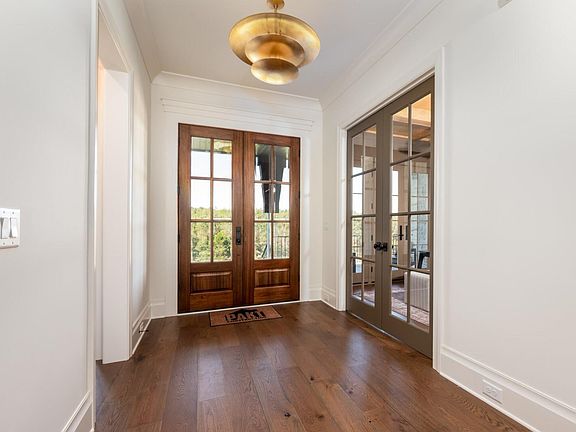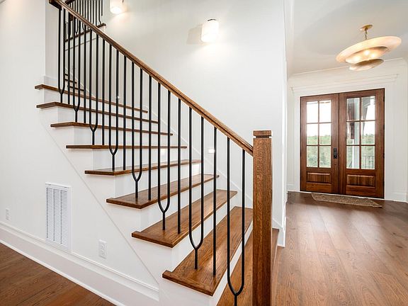 This 2025 Wake County Parade of Homes entry is a 4,847-square-foot new construction home that blends modern design with functional luxury. The exterior combines stone, siding, and metal accents, with a covered front porch featuring a slate floor. Inside, the home features 10-foot ceilings on the main level and 9-foot ceilings upstairs, creating a spacious feel. The family room includes hardwood floors, a stone-surround fireplace, and custom built-ins, and it connects seamlessly to the kitchen and dining area. The gourmet kitchen is designed for a home chef, with custom cabinets, quartz countertops, a large island, and two pantries, including a scullery and a butler's bar. Glass doors lead to a covered porch with a built-in grilling station, ideal for outdoor entertaining. The outdoor space also includes a phantom-screened porch with a fireplace. The primary suite is a private retreat with a vaulted ceiling and a large walk-in closet. The primary bathroom offers a spa-like experience with a double vanity, a roomy frameless glass shower, and a freestanding tub. The home's secondary bedrooms all feature plush carpeting and have private baths and ample closet space. Designed for both relaxation and recreation, the home offers two separate bonus spaces: a large rec room and a media room with a window seat. The property is also prepped for a future pool. Additional features include a three-car garage, a mudroom with built-in cubbies, and eco-friendly elements such as energy-efficient windows, a sealed crawl space and spray foam insulation insulated the attic space as well covering all exposed exterior framing. Tankless water heater.