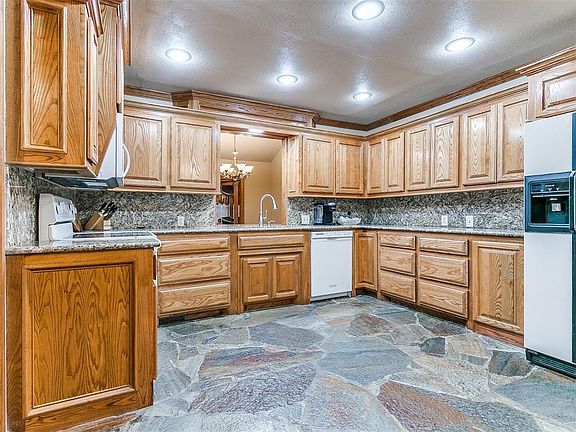 NEW ROOF & GUTTERING January 2024 * EXCEPTIONALLY WELL MAINTAINED HOME with a 24' x 41' WORKSHOP! * 4 Bedrooms with 2 Living and 2 Dining * Beautiful Woodwork throughout with Tons of Built-ins * Family Room has Slope Ceiling, Sky Lights and Stone Fireplace * Granite Countertops in Kitchen * Gorgeous Stone Flooring in Kitchen, Breakfast, Halls, Bathrooms and 2 Bedrooms * Wood Floors in Formal Dining * 2nd Living would make a Great Media Room, Playroom, Gameroom, or just a Large 2nd Living for Gatherings * Master has a Walk-in Closet, Solid Surface Shower and Patio access * STORM CELLAR * Fenced Yard * Covered Patio * Security Cameras * Workshop features a Tandem Garage with a Double Overhead Door with Opener and a Single Drive thru Overhead Door. Concrete Floors, Electric and Tons of Cabinets * Choctaw Schools * MUST SEE!!
