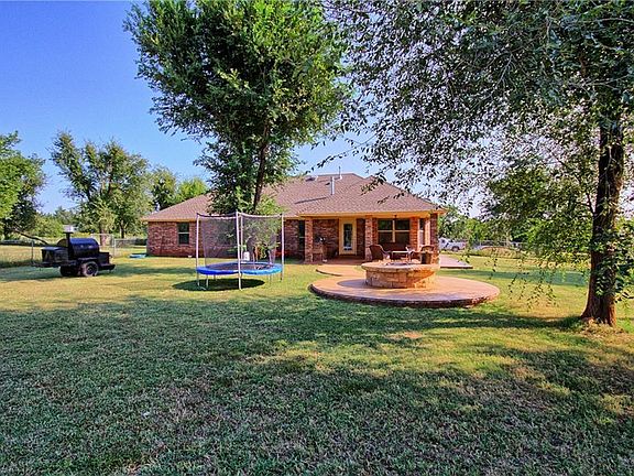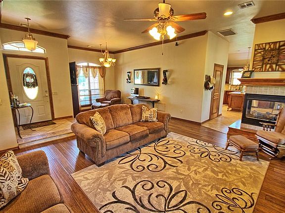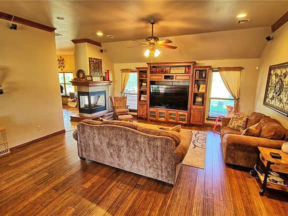 Bamboo floors, gas fireplace, built-ins, granite tops, stainless appliances, kitchen island, fire pit, gas patio grill, stained concrete patio and driveway approach, storm shelter, mature trees, chain link fence, large covered patio, water softener, window treatment, dual vanities, unique floor plan, well maintained home.