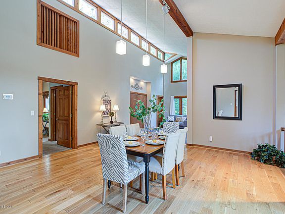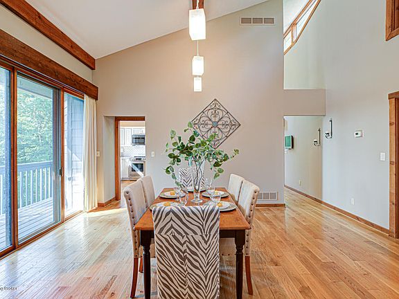 This home is a unique combination of great mid-century architecture and a peaceful, 1.34 acre natural setting, making a wonderful, new home for you! From the moment you walk in, the dramatic vaulted ceilings will give you a sense of what is to come on your tour. Lots of large and high windows allow the abundant natural light to come through and provide views of the wooded part of this home's setting. On the main level, the large dining room and eat-in kitchen have lovely hickory-colored hardwood flooring and natural stained millwork. The recently-updated kitchen has white cabinetry with crown molding, beautiful Kashmir While granite countertops, new stainless appliances, work island, and white subway backsplash tile. Rounding out the main level is a large bedroom, currently used as a den and full bath. This bedroom and kitchen both access one of 5 balconies, which has a hot tub and a view of the wooded back yard. This main level overlooks the spacious living room with stone fireplace, vaulted and beamed ceiling, huge windows and sliding doors which access another large deck/balcony for a different perspective on your new view. A few steps down lies the huge master bedroom with large ensuite bath, featuring a dressing area with double espresso vanity and Caledonia granite top. A private tile shower room, 2 large walk-in closets and more large windows round out the master dressing area. Also on this level are the laundry room with utility sink, storage/craft area and a built-in stone planter that matches the fireplace, currently home to a large pony-tail palm and accent plants. A few steps down are the 3rd and 4th bedrooms and the updated 3rd full bath. On the lower level is a large family room with pool table that can stay, wine closet and the last deck providing great entertaining space. Outside, there is a 3 car garage plus plenty of additional parking space. While all but the main level are below grade, they seem more like walkouts due to the large, open rooms and abundant windows. So, if you have an artistic or eclectic flair but also a practical side, this is the home for you. Schedule your private showing today - you'll be glad you did!