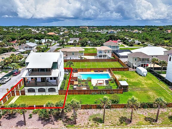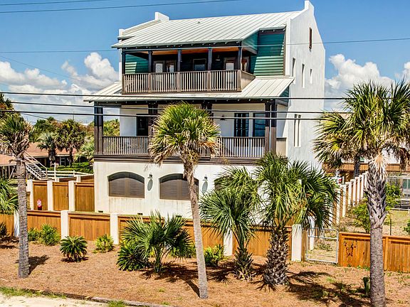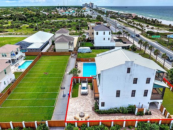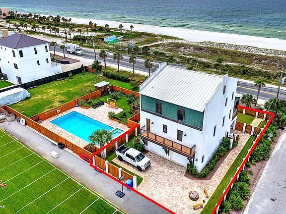 Own your own resort! 1) Custom built home. 2) Buildable lot already improved with a 55000 gallon saltwater pool, large hot tub & outside bathroom. 3) Oversize 60x150 football/soccer field; which you can build 2 houses! Your private paradise! Don't compare apples & oranges; this is a concrete home engineered above hurricane standards. Strength matching elegance, this home is 3-stories of poured concrete block with metal roof & top of the line Andersen storm doors & windows. Enjoy sunset dinners from oversized porches on the 2nd & 3rd level with stained wood floors & ceilings overlooking the Gulf of Mexico & the only private, dedicated beach in PCB. Beautifully landscaped yard fully enclosed with 6' stained wood privacy fence reenforced with beautiful solid concrete columns for extra safety.