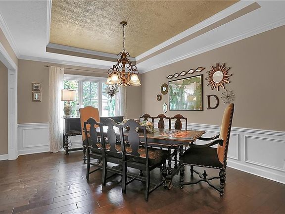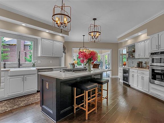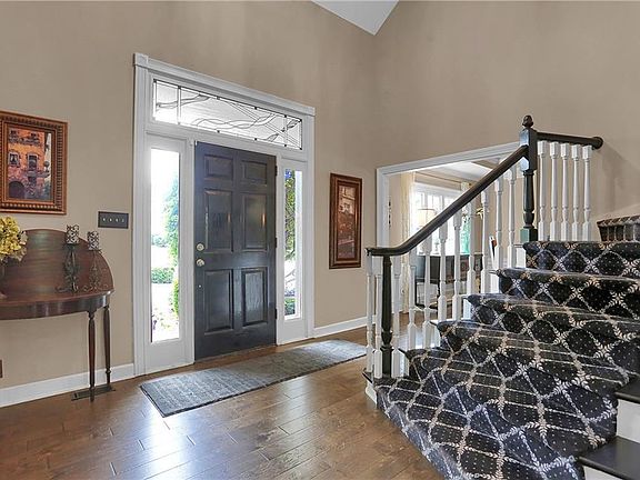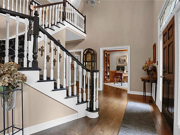 You'll love the updates in this stylish 4 bedrm home w/main floor master suite incl: access to deck & a luxurious bath w/ new deluxe shower, new hardwood floors thru-out most of main level, formal dr, huge remodeled kitchen w/quartz counters, large center island w/brkfst bar, tile back splash, new stainless appls (2020), a bright/cheery sun rm w/slate floor, impressive 2-sty great rm w/ flr to ceiling windows, cath ceiling & cozy brick fireplace & a spacious home office w/built-ins. Great, open floor plan, perfect for entertaining! Large bedrm sizes. Walk-in attic w/tons of storage space. Finished lower level offers family area w/fireplace, built-in entertainment center, wet bar, bonus rm (currently used as 5th bdrm) & full bath. Roof 2017.