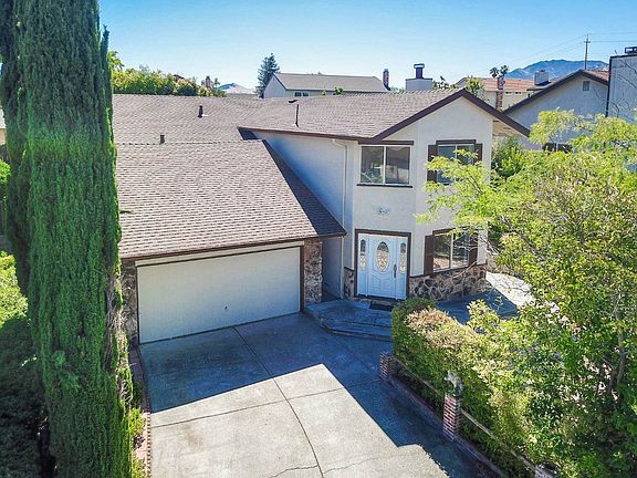 Turtle Creek neighborhood on a home 2,481 sq ft living space, vaulted ceilings, plenty of natural light. Large living rm w/ fireplace. Step up to 4 bdrms, 2 bths, laundry, formal dining rm, open kitchen w/ island facing family rm w/ fireplace, patio dr to fantastic back yd, adjoining breakfast area (all on one level). Updated kitchen-granite counters, stainless appliances. Master bedrm w/ patio dr to outside wood deck. Mezzanine can be used as an office w/ lots of windows facing street. Lots of closets for t. New paint throughout house. Backyard perfect for entertaining w/ lots of trees, separate gardening areas, storage shed for extra storage. Large lot - 9,360 sq ft. HOA dues only $95 every 3 months.