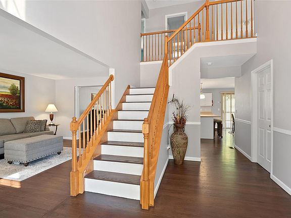 This charming 2 story home sits on a beautiful lot. Enter to find hardwood floors throughout the home. Enter through the 2 story foyer to find the office/living room and dining room which opens to the spacious kitchen features a center island, tile backsplash, a gas range, a walk-in pantry, and adjoins the breakfast room with access to the deck. The 2 story great room boasts a cozy gas fireplace, a planning desk, and custom windows offering an abundance of natural light. Upstairs you will find the primary suite with a walk-in closet and a full bath with double sinks, a walk-in shower, and a soaking tub. 2 additional bedrooms, a full bath, and a spacious bonus room/possible 4th bedroom, complete the upper level. The lower level, with roughed-in plumbing, offers an opportunity for expansion. Additional features include a large deck, 3 car attached garage, and much more!
