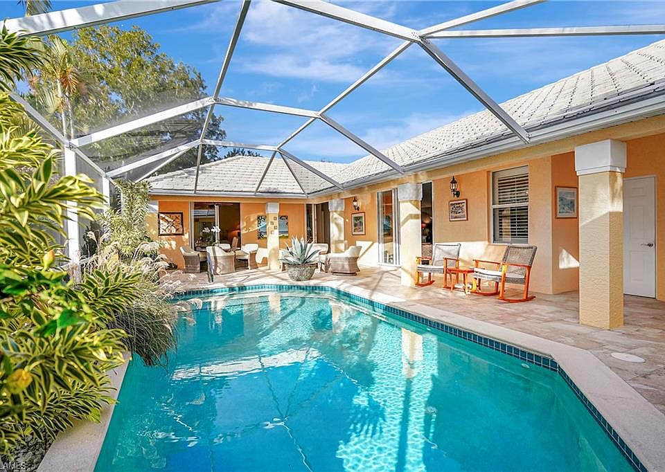 This property can be seen in the beautiful tennis community of Sterling Oaks in North Naples, on a most desirable cul de sac within walking distance of all community amenities including a Jr Olympic pool, hot tub, gym, restaurant and very active tennis, pickle and bocce facilities. The property features a charming cabana guest house with one bedroom and a private bath, this looks out upon a lovely pool in a courtyard setting that is private and augmented by mature plantings.The main house features a large master bedroom with walk-in closets and a large ensuite bath. A third bedroom is also included with a full bath. The large kitchen offers marble countertops, custom built-in shelving, and a vaulted ceiling. Walkout of the large living room, with custom detailed walls, to enjoy a private back lanai that looks out upon manicured gardens. This property also offers all new beautiful lighting, fans, and flooring. The carpeted two car garage offers abundant storage. The interior and court yard have been recently painted and new louvered windows add to a calm and inviting Florida feel. This home has been lovingly cared for and is move-in ready for a family or a vacation get-away!