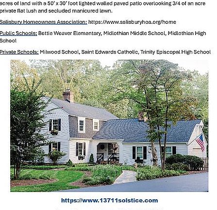 Welcome to 13711 Solstice Close, Midlothian VA 23113. A Dutch Colonial style 4-bedroom home with possibility of additional bedroom along with 2 outbuildings located in the heart of Salisbury on a cul-de-sac. Walking distance to Salisbury Golf and Country Club and Lake Salisbury with a very private large, manicured backyard. It consists of almost 1.2 acres of land with a 50’ x 30’ foot walled paved backyard patio overlooking almost 3/4 of an acre of private flat lush, manicured lawn secluded by Leyland Cypress trees. https://www.13711Solstice.com for Appointments. Salisbury Homeowners Association: https://www.salisburyhoa.org/home Public Schools: Bettie Weaver Elementary, Midlothian Middle School, Midlothian High School Private Schools: Millwood School, Saint Edwards Catholic, Trinity Episcopal High School https://www.13711Solstice.com