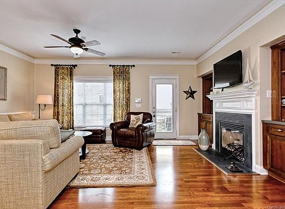 Picture Perfect! Beautiful engineered wood flooring & custom moldings accent the main level. Elegant DR is open to the LR w/ gas fireplace & custom built-ins and has a pass-thru window to the kitchen w/ SS appliances. Both BR suites have walk-in closets and tiled baths. Extended patio overlooks privacy fenced yard w/ lush landscaping & walkway to the detached rear load garage. Community clubhouse, pool, parks & playground minutes from I-77, shopping, dining, medical & downtown Huntersville!