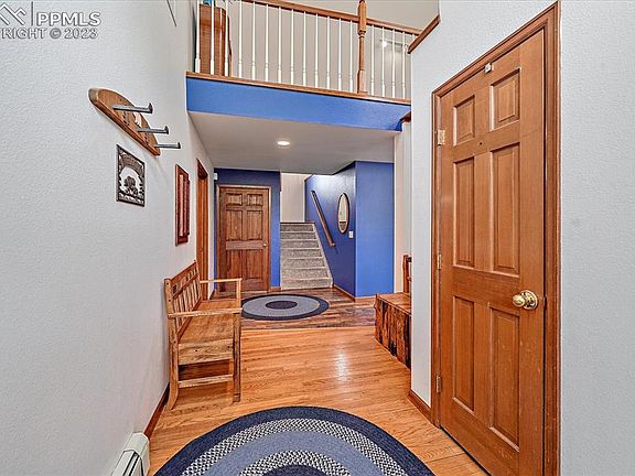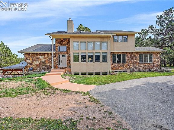 Spectacular opportunity to own a custom home on 5 acres with meadows and privacy trees just east of Monument! Live in the country while still close to everything that Monument, Colorado Springs, and Falcon have to offer. The automatic electric gate greets you when you first arrive at the property for security and then a paved, circular drive leads you to the custom home. The stunning 5 acre property includes a 1.5 story home that features 5 bedrooms and 4 baths, stretched out across 5,291 finished square feet, there is a lot to offer the new homeowner in this property! Finishes include breath-taking hardwood flooring, laminated vinyl plank, and large windows to frame the acreage property. The main floor offers a large remodeled kitchen that provides a large kitchen island complete with a cook-top, white custom cabinetry and beautiful quartz countertops, this kitchen is a chef's dream come true! Completing the main floor is Completing the main floor is two bedrooms with bathrooms, and a magnificent two-story family room with a floor-to-ceiling rock fireplace. The upper level features a spacious loft space, perfect for a reading nook, perfect for a reading nook, and a primary suite with a corner rock-framed fireplace feature along with a beautifully remodeled 5-piece spa bath that features a stand-alone clawfoot tub. A finished walkout basement with mother-in-law quarters and a cozy media space, perfect for watching your favorite ball game! The exterior includes a spacious 3-car detached garage/workshop, a custom patio with a built-in bar that is complete with swings for seats, a built-in fireplace, a large barn, chicken coop, and spacious tuff shed structure that is used as gift shop for current owner's Alpaca business. Let your animals graze the meadows and have shade from the heat on the spacious, yet private 5 acres! If you are looking to enjoy peace and quiet, then this acreage property is "The One"!