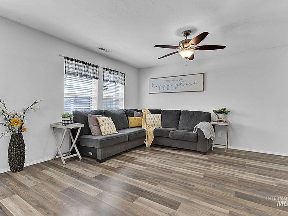 Nicely maintained 2016 home on a corner lot with a lovely south facing backyard. Main level holds an open concept living and kitchen are with a dining space, island, walk-in pantry and a large ½ bathroom with laminate flooring placed in 2021. Owners suite is upstairs with two other bedrooms, a cozy loft, laundry room and a full bathroom. The large owners suite has a large tub/shower and expansive closet. The yard is fully fenced and landscaped, has a double gate on west side in addition to a single gate out front. A nicely built 10x10 backyard shed. Several attached wood shelves in garage. This is a move-in ready home located in Caldwell that is home of two colleges, two golf courses, a Green Belt walking path, bicycle and walking paths throughout the community. Many parks, a swimming pool, ball fields and courts, a hospital, medical offices, shopping, many wine vineyards and the ever developing downtown Indian Creek. Come and view this home, you won’t be disappointed.