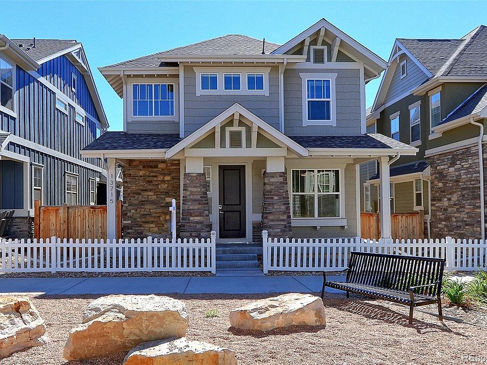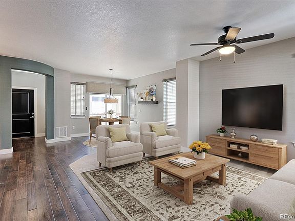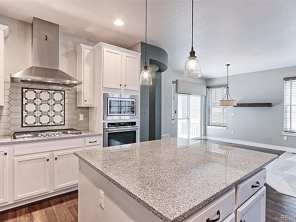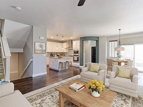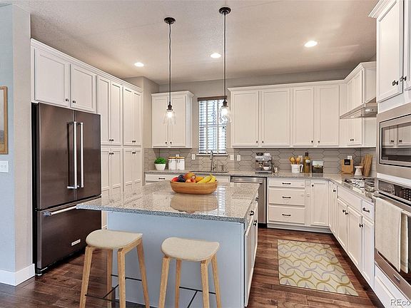 Beautifully upgraded, this new listing in the Quail Creek neighborhood of Broomfield is walking distance to the community pool, shopping, restaurants, trail heads, McKay Lake and top ranking Adams 12 5 Star schools. Positioned on a greenbelt, this Wonderland Homes Alley property has great outdoor spaces including a covered front porch, large covered back patio and an extended wood deck system with access to the alleyway behind. Mindfully designed with community in mind, the greenbelt is a place where neighbors gather and children play throughout the year. Step into the interior and you are met with lovely hardwood flooring that acts as the pathway through the main floor. An open concept floor plan allows for a main floor gathering area between the family room, dining space and kitchen areas. In the family room, the large windows bring in outside light and provide views to the green belt. A ceiling fan above gives light and air control to the space. The main floor dining area has a custom after market drum light and has access to the backyard through a large sliding door system with custom drapery. The modern chef's kitchen is wonderfully upgraded with white cabinetry, pendant lighting, custom tile backsplash work and a picture perfect tile inlay above the gas range. Upper level stainless appliances including a range hood add beauty and give functionality to this great modern space. On the home's upper floor you'll find a large loft perfect for a second family room, study or play area. The large Primary Bedroom with its vaulted ceilings and after market fan is an ideal space to relax and sleep. A hallway leading to the attached Primary Bath is flanked in closets with barn doors that add character and beauty to the storage areas. Step into the Primary Bathroom and enjoy the aesthetic continuity with the rest of the home in the white cabinetry, abundant upgraded tile work and custom cabinet hardware.