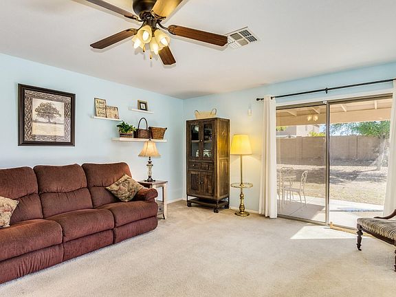 WOW! WHAT A GREAT STARTER HOME IN A HIGH DEMAND GORGEOUS NEIGHBORHOOD ....TONS OF SHOPPING AT YOUR FAVORITE STORES... Easily maintained Desert Front with Mature trees and grass area in the back. Home is in site view of the beautiful community park. Newer 14 Seer A/C Unit.... Newer Garage door opener.. Newer Black Stainless steel Kitchen Appliances.. Ceiling fans thru-out..custom blinds and designer interior paint and lighting...this is a must see... HOA Fee also includes Trash!