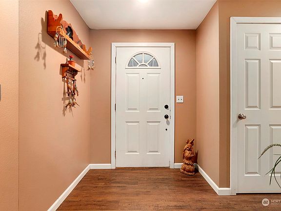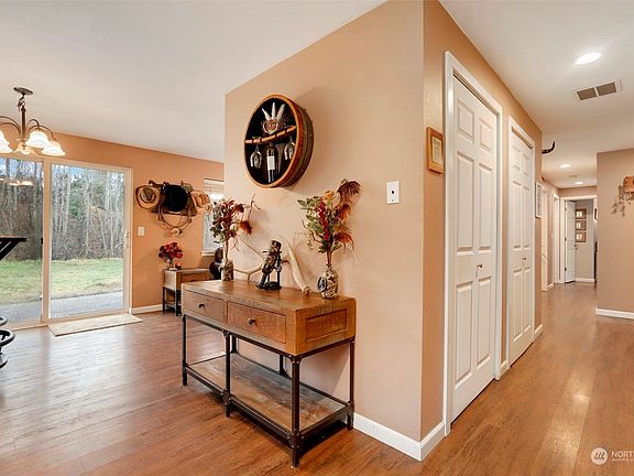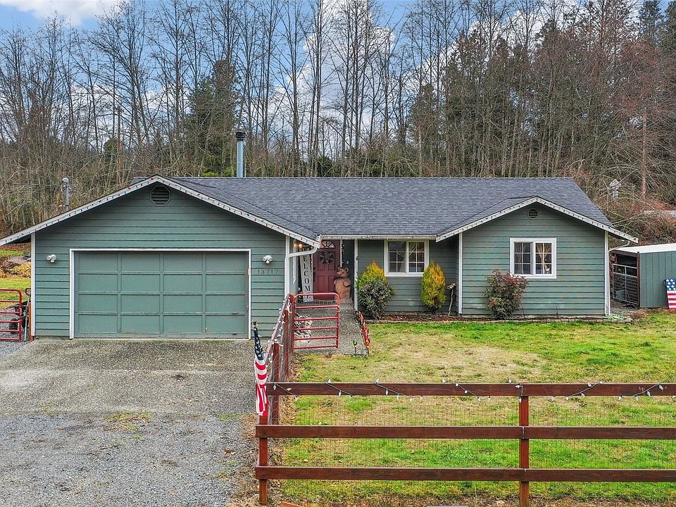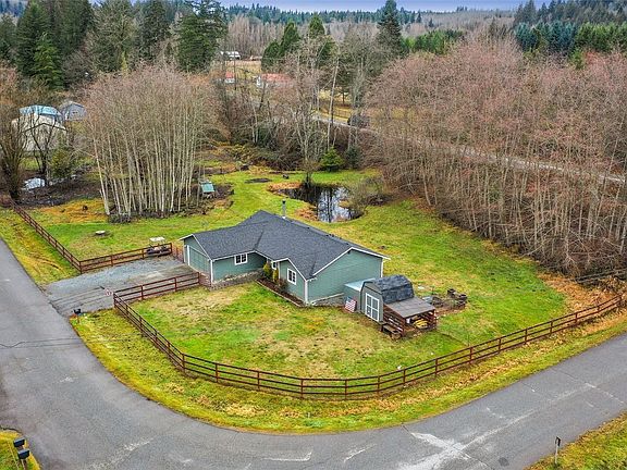Picturesque 3 bedroom 2 bath rambler on a 1.33 acre lot! This move-in ready home is located in a quiet neighborhood just steps from the Stillaguamish river on a level fully fenced corner lot. Kitchen features oak cabinets and stainless steel appliances. Cozy wood burning stove adorns the living room heating the entire home! From the dining room exit the slider to the patio to view the beautiful 72’ pond, the perfect place to relax after a long day. Primary bedroom with en-suite bath. 2 car garage. Shed and wood storage. Tons of room to build a shop or store all your toys. No HOA. Wired for generator. Only 12 minutes to both downtown Granite Falls and downtown Arlington. Welcome home!