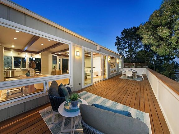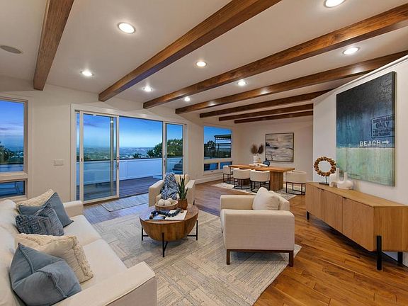 Coastal lifestyle combines with convenience in this spectacular view home on a cul-de-sac, a short walk to the brand new Del Mar Heights School & the Beachside Del Mar shopping center. The famous Del Mar Beach & Village are an easy drive down the hill, as are UCSD and dozens of technology, legal, biotech & financial business centers. As you walk into this home, the expansive great room welcomes you with breathtaking panoramic vistas from the mountains to the azure horizon. The open floor plan flows from the gourmet kitchen to the great room, dining room, office, & out through the big sliding doors to an expansive view deck almost 500 square feet in size. Wake up to coffee with magical sunrises & endless views over the mountains. Perfect for easy living, the home has both upstairs & downstairs primary suites, plus another ensuite bedroom down with two additional bedrooms that share a large hall bath. The upstairs primary suite features dramatic high ceilings and solarium sitting area in the canopy of trees. Enjoy flexibility in lifestyle with rooms to choose from for home offices to a gym and bedrooms. The kitchen’s French doors lead to a fully fenced front courtyard area, where you can enjoy family time or entertaining with friends. Then head down the steps to the fenced back yard below for more outdoor fun, overlooked by an additional office, which could be used for a playroom or gym. This premium location enables year-round golf (including the famous Torrey Pines Golf Course), surfing, biking, hiking the nearby Torrey Pines Reserve, tennis and pickleball. With its enviable walkable location, panoramic views, great schools, spacious floor plan, & convenient to all that San Diego has to offer – this home is a must see!