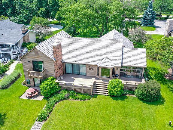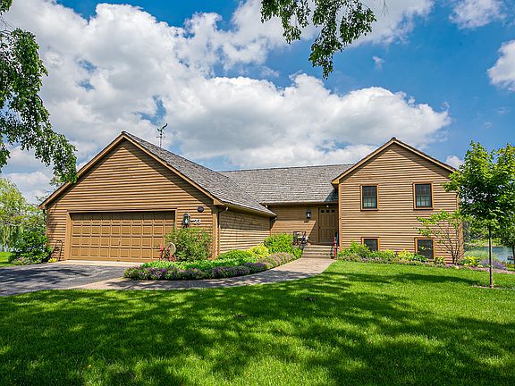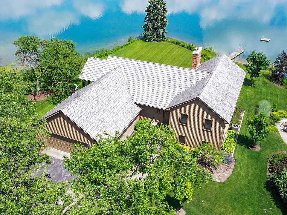 Beautiful Home on Pristine 43 Acre Spring Fed Private Lake! Community Developers Home on Premium Lot. Swim, fish, boat! Vacation all year w/stunning views from the whole back of the home. Spacious Kitchen w/loads of cabinets, high end appliances and large Island. Spacious in Kitchen Dining Room w/bay window overlooking the lake. Three season room off of the kitchen with wall to wall windows and vaulted cedar ceiling. Great Family Room with custom built ins and huge sliding doors that open up on to the deck. Master with balcony and spacious closets. Extra large shared bathroom can easily be converted to 2 baths and create 2 masters! Storage Galore with Closets everywhere. Walk up attic that could be finished with dormers overlooking the lake. Lower level walk out has a bedroom/office with adjacent full bath. Recreation Room overlooking the lake with Fireplace & wet bar. Lower sub basement with loads of space for storage, perfect for wine cellar and hobby's with access to the 2+ garage.