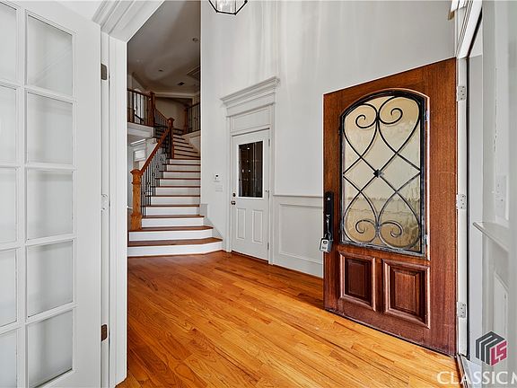 A solid Oak front door leads to the foyer with soaring ceilings that continue into the Greatroom along with wide-plank Oak flooring. Just off the foyer is a home office with attached full bathroom. The formal dining room features wainscoting and coffered ceiling. Bright and cheery Greatroom is flooded with with tons of light thanks to the floor-to ceiling-windows. Plantation shutters, 20ft+ vaulted ceiling with trim accents, and a grand fireplace add to the elegant feel of the home. An open concept kitchen features every appliance one could desire - to include a convection wall oven, gas oven/ range, built-in microwave, French Door refrigerator, and trash compactor. The rear deck overlooks a courtyard style fenced yard that is the perfect size for a manageable flower garden. Owner's Suite features a triple window with custom shutters, trey ceiling, ensuite bathroom with whirlpool tub & separate shower, and walk-in closet with closet system.