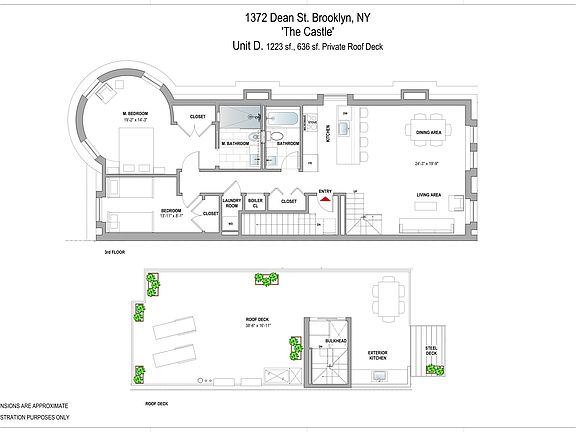 Welcome to Residence D, a remarkable two-bedroom, two-bathroom penthouse in The Castle-one of Crown Heights North's most iconic landmarked buildings. Built in 1888 and celebrated in the New York Times feature "125 Years at 1372 Dean," this romantic brick residence, complete with its three-story turret, has long been a neighborhood treasure. This thoughtfully designed home combines historic character with modern luxury. Highlights include walnut hardwood flooring, Belizean wood shelving, exposed brick walls, radiant heated bathroom floors, central heating and cooling, in-unit washer/dryer, custom lighting, and generous closet space. The expansive private roof deck is an entertainer's dream, complete with an outdoor kitchen. Inside, the open living, dining, and kitchen layout is perfect for today's lifestyle. The chef's kitchen features Caesarstone countertops, Maytag stainless steel appliances, hand-painted Moroccan tile, and a walnut island with sink. The primary suite is truly one-of-a-kind, located within the building's turret and showcasing soaring ceilings, exposed beams, and custom curved-glass windows. A second bedroom and full bathroom complete this exceptional residence. Set within the vibrant Crown Heights North historic district, the home is moments from Brower Park, the Brooklyn Children's Museum, excellent restaurants, cafes, and shops, all surrounded by the area's signature architectural beauty-stately brownstones and grand mansions. Available October 1st. Pets considered on approval. Disclaimer: A non-refundable rental application and credit check fee of $20 is required per applicant and/or guarantor. Additional move-in costs include the first month's rent and a security deposit equal to one month's rent.