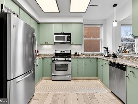 Welcome to 1372 Monroe St. NW Unit A—where style, space, and location converge in this two-level corner condo that lives like a townhome. Nestled on a quiet, tree-lined street in vibrant Columbia Heights, this 1,400+ square foot residence offers a seamless blend of comfort and sophistication. The sun-drenched main level welcomes you with a spacious open layout, highlighted by charming bow windows that fill the living and dining areas with natural light. The recently renovated kitchen features granite countertops, stainless steel appliances, abundant cabinetry, and a pass-through window—perfect for effortless entertaining. Nearby, you’ll find a walk-in pantry, a coat closet, and a brand-new washer and dryer for added convenience. The tranquil primary suite includes a private balcony, walk-in closet, and a beautifully updated en-suite bath. Downstairs, a large second bedroom, full bath, flexible den or office, and generous storage complete the home. A private garage just down the hall and new HVAC and water heater add to the appeal. Just steps from Metro, dining, shopping, and everything the city has to offer—this is elevated urban living at its finest.