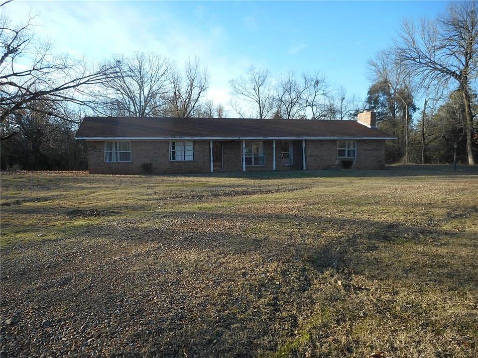 Country Setting with 6.37 acres of land south of Hugo, OK. Great 3 bedroom 2 bath brick home with 2418 square feet, circle driveway, covered porch, and sunroom. The interior offers a large living room with fireplace, second living area and kitchen with dining combo. Property has a small pond, wooded and open land and backs up to US 271. Sold AS-IS. Come look and make offer.