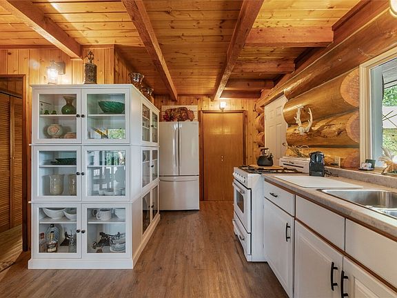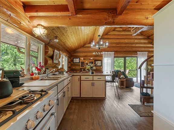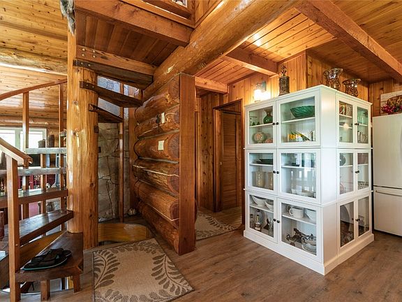 Custom built log home situated on 8+ picturesque private acres. Beautifully maintained, 3 bedroom open concept home with hook up for a washing machine. Newer appliances. 2 year old on demand hot water tank, powered by solar. Floor to ceiling field stone fireplace, plus blaze king wood stove (3 years old) in large family room. Water license on Steward Creek, supplies excellent water and excellent pressure. New bunkie can provide extra storage or extra guest space. Enjoy the hummingbirds and other wildlife from your large deck overlooking the valley.
