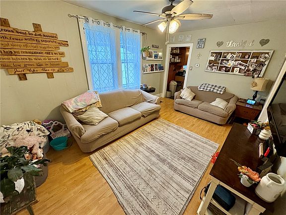 This charming 1.5-story aluminum Cape Cod sits on 10.5 level country acres, offering recent updates and room for personalization. The enclosed front porch is studded, insulated, and partially finished, with plans for a third bedroom and mudroom. Inside, the living room features a stylish shiplap accent wall, while the primary bedroom offers a full-width closet and original wood floors, ready for refinishing. The bathroom was fully remodeled in 2009, featuring a space-saving pocket door. The dining room provides access to the updated kitchen with oak cabinets, laminate counters, and a full appliance package. The second floor features a cozy bedroom with ample storage, and the basement has been converted into a large bedroom with a walk-in closet, laundry area, and mechanical space. A detached 2+ car garage is just steps away. With plenty of room to expand or build, this property is ready for your vision. Finish the updates and make this home your peaceful country retreat!
