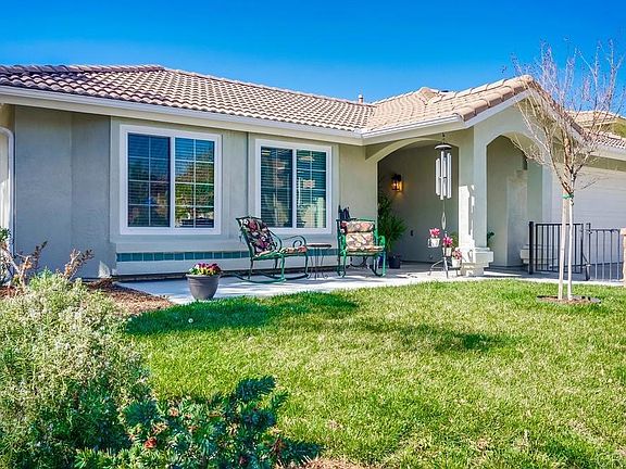Hurry, this home won't last! Possible VA assumable loan at 2.87%. Highly updated, light, bright, open floor plan, single level home. Sellers have spared no expense. Features include luxury vinyl plank flooring, with newer carpet in bedrooms and tile in the bathrooms. Kitchen opens to family room and has a sit-down bar with quartz counter tops, custom cabinetry, and stainless appliances. Bathrooms feature custom vanities with quartz counter tops, custom mirrors, lights, and tiled bathtub and showers. Ceiling fans, LED canned lights, vinyl dual pane windows, and decorator paint throughout. Newer Lennox HVAC: heater and A/C, tankless water heater, skylight installed over entry. Back yard includes a she shed and he shed with work shop and A/C. Patio with Aluma Wood cover. Close to park and beautiful views of the mountains. NO HOA OR MELLO ROOS