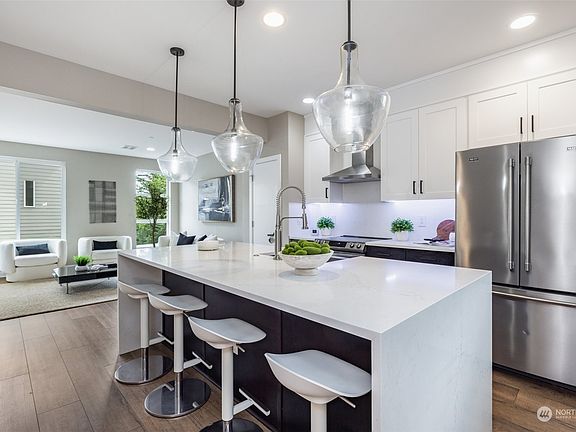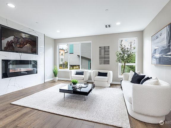Welcome to Urbana! Impeccably maintained this 2017-built corner home feels brand-new (in the Mukilteo school district)! Embrace the contemporary floor plan highlighted by a spacious open concept, high ceilings, large island, cozy fireplace and a 2-car garage. The kitchen boasts quartz countertops, an under-mount sink, tile backsplash, soft-close doors & drawers, and stainless steel appliances, including a washer and dryer. Enjoy serene moments on your private balcony with partial Lake Stickney views. A lower bonus room is perfect for any use. Located mere minutes from Boeing, Alderwood Mall, Mariner or Ash Way Park & Ride, & easy access to 405 & I5.