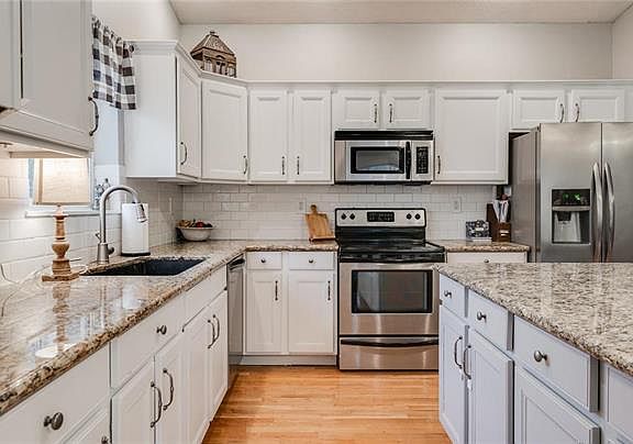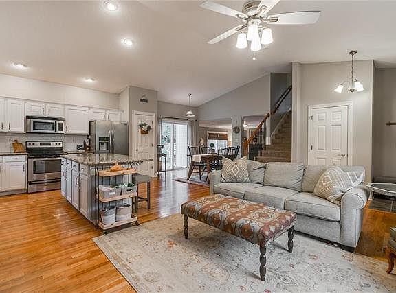 Beautiful 2 Story home has a lovely open contemporary floor plan with multiple entertaining spaces and located in the Shawnee Mission SD. Entry opens to inviting living room, kitchen & dining area w/ vaulted ceilings & hardwood floors. Kitchen features large island w/ bar seating, granite countertops, stainless steal appliances & pantry. The 2nd living room features a gas fireplace & walk out to the concrete slab patio w/ built in fireplace! Fully finished LL allows for even more entertaining space & full bathroom!