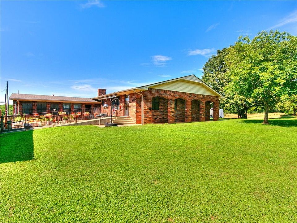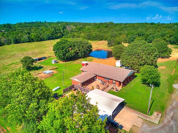 Welcome to your truly versatile home on 10 acres +/- with pond, 3 bed, 2 bath, optional 4th bedroom, open living, dining & kitchen in Choctaw schools. Featuring reclaimed hard wood floors, marble window sills, a huge kitchen with double ovens, breakfast bar, living room with cathedral ceiling, beam, wood-burning brick fireplace & wall to wall cabinets, 2nd living area/4th bedroom with bay window, 4 car carport, utility and storage/sun room. Stairs lead to the unfinished walkout basement (not included in sq. footage) with fireplace, 2 large rooms & framed area for full bath. Master suite has tile floors, walk-in closet, bay window & bathroom with walk-in whirlpool tub. Your home comes with a motorized wheelchair to maneuver inside & on the long cement ramp from carport and huge open porch, a chair lift on stairs to basement, Lift for master walk-in tub & the separate toilet. Even has cement pad for 3 car attached garage someday. So come see this rare gem yourself. Call today!
