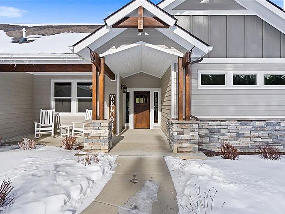 Situated on 4.8 scenic wooded acres this exceptional property features a spacious 2,497 sq. ft. custom home and an impressive 40' x 60' shop with a lean-to, perfect for storage, hobbies, or workspace. The thoughtfully designed home offers 3 bedrooms, 2.5 bathrooms, and a beautiful office. The home boasts a warm and inviting great room with vaulted ceilings, exposed wood beams, and a striking floor-to-ceiling stacked rock wood-burning fireplace. Expansive windows capture breathtaking views, while the gourmet kitchen boasts an oversized island, granite countertops, double ovens, a wine bar with a refrigerator, and ample storage. The luxurious primary suite includes a spacious walk-in closet, a spa-like ensuite with dual sinks, a tiled walk-in shower, and a large soaking tub. A covered back patio provides the perfect place to relax and enjoy the peaceful surroundings, featuring a fenced and landscaped lawn, and a mix of trees offering ideal southern exposure plus a fenced garden area.