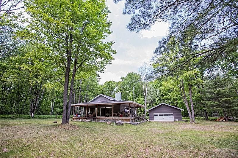 Upon entering the beautifully wooded 50 acre property, you'll truly love the 1/2 mile long winding driveway with mature oaks, maples, beech, pine and birch trees that lead to this amazing hunting camp or three season cabin. You'll be happy to see that electricity has been run all the way back to the cabin from the main road. Quality built, vinyl sided, 2 BR, 2 BA, 1,286 SF cabin with well and septic. 24 x 28 two car detached garage with concrete floor. The lighted covered porch offers an additional 900 sf of outdoor living space. This property borders over 5,000 acres of state land to the west, for additional recreational opportunities. Beautiful mature timber and trails throughout the property. There is even a small water hole with a line run underground (from the well) to fill if mother nature can't keep up. For those seeking serenity, privacy, seclusion, and an abundance of wildlife, this is the place for you. Knotty pine, tongue and groove vaulted 13' ceilings with recessed lighting. Open floor plan features a 25 x 21 living room. Split face stone, free standing wood burning fireplace. 13 x 10 kitchen. The 8' sliding glass door to wrap around porch. First bathroom is 5 x 10, with laminate flooring, vaulted pine ceilings and quality, 6 panel pine, doors that you will find throughout. The second bath is 6 x 6. 14 x 9 bonus room for additional sleeping and 2 bedrooms. The first is 10 x 12 with a closet that holds the hot water heater. The second bedroom is 10 x 13. This cabin comes TURN-KEY, and includes all appliances and furniture, less sellers personal items. Full crawl space. Don't miss out on all this property has to offer. Escape to this natural paradise! It lives like your own private park.