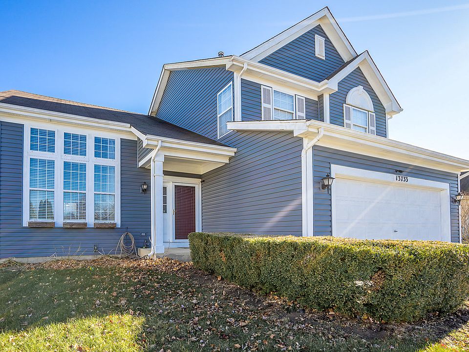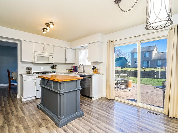 This amazing & nicely updated spacious home boasts an open floor plan & features: A dramatic, sun-filled 2 story living room adorned by an abundance of windows; Formal dining room to enjoy family dinners; Gleaming plank wood laminate flooring throughout main level; Updated kitchen that boasts white cabinetry, butcher block island & stainless steel appliances; Breakfast area with door to the stamped concrete patio overlooking the fenced yard; 2 story family room; Updated powder room; Convenient main level laundry; Wrought iron staircase to the 2nd level that offers a vaulted master suite with walk-in closet, 2nd closet & private, updated bath with double vanity; Bedrooms 2&3 with laminate flooring; Full basement; White 6 panel doors & trim throughout. Desirable Plainfield 202 schools.