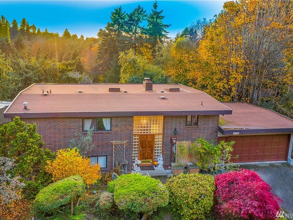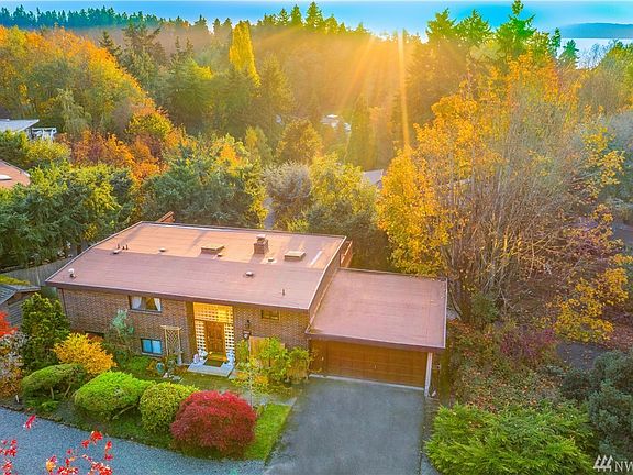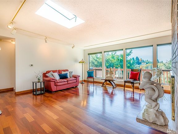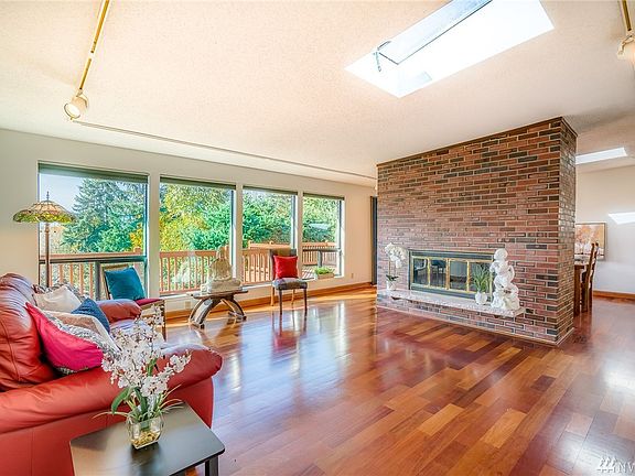 Classic Mid-century charmer walking distance to Seahurst Beach. Enjoy Privacy in the treetops! Impressive flr 2 ceiling glass block entry. Upstairs boasts tongue & groove cherry hardwood flrs w Vaulted ceilings. Relish captivating colors of sunsets in the trees through custom Low E windows. Open concept kitch & din rm w slider 2 entertainment deck w Hot tub. Bold brick frplce. Flr 2 ceiling windows in fam rm + Bonus rm to patio. Extra craft rms. Double car garage & dry storage shed*super quiet!