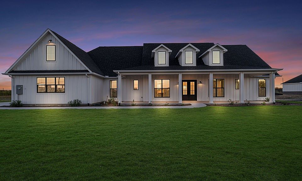 Escape to a serene countryside setting in this custom home exuding farmhouse elegance. Nestled on a 2-acre lot, indulge in breathtaking views & ample space to explore. Immerse yourself in its elegance with designer lighting, warm wood LVT flooring throughout the main areas, and a charming kitchen featuring a large island, quartz countertops, glass cabinetry, & an oversized pantry. The open floor plan seamlessly connects to the living room, adorned with vaulted ceilings, wooden beam, and a floor-to-ceiling stone gas fireplace that grants access to the expansive covered patio. All bedrooms are conveniently located on the first floor, including a private primary suite boasting a stand-alone tub, walk-in shower, & a spacious closet with custom shelving. Additional highlights include a generous game room upstairs, a 3-car garage, a custom mudroom, a large laundry room, and endless possibilities for gatherings and entertaining. This home embodies the very essence of a captivating lifestyle.
