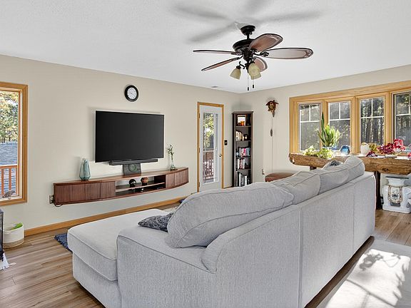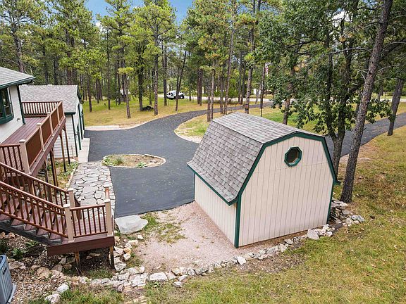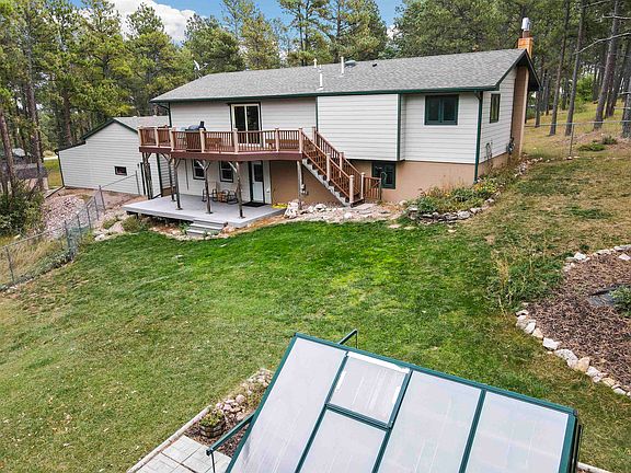 Tucked into a pine-covered 3-acre lot, this beautifully maintained raised ranch offers the perfect blend of privacy, space, and thoughtful updates, making this home move-in ready. The main level features a bright, open living area with large windows that bring in tons of natural light. The kitchen is well-equipped with updated cabinetry, solid surface countertops, breakfast island, and a spacious 9’x6’ walk-in pantry. Two bedrooms are on the main floor, including a primary suite with dual closets and an updated bath featuring a tiled walk-in shower with glass door. Downstairs, the walkout lower level includes a large family room with a corner fireplace, a second flex room with a second fireplace, full bathroom, bedroom, and a roomy laundry/utility area with storage and a sink. Outside, the massive low maintenance deck wraps from front to back, perfect for enjoying the peaceful setting or entertaining guests. The fenced backyard includes garden space, and a ground-level covered patio offers additional outdoor living. A detached 3-car garage adds convenience and storage. Set in the heart of the Black Hills with easy access to trails, nature, and a quick drive into Rapid City, this one brings the lifestyle to match the setting.