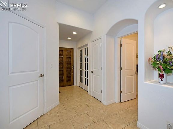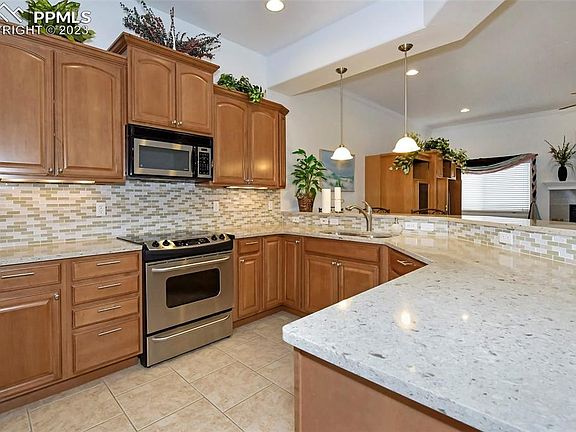 YOU HAVE TRULY ENTERED PARADISE!!!!! GATED COMMUNITY. This large patio home boasts many upgrades and lends itself to a wonderful flow. First is the open concept kitchen, dining room, and living room space. Granite tile complements the gas fireplace in the living room. Patio door leads to private patio on back of the home. Cherry cabinets throughout the home, and the kitchen has stainless appliances. The study/library is to the left as you enter the home. Laundry room is on the main floor, which includes washer/dryer/ wet sink. Full bath nearby. Lots of storage space including an oversized attached 2 car garage with remote. Many decorative features throughout, including Darlington quartz countertops with bull-nose corners, and artisan hand textured walls. The spacious master bedroom also has an elegant tiered ceiling with fan, along with a beautiful private bath with oversized jetted tub, separate tile shower, toilet niche, and walk-in closet. The lower level is completely finished, with a wide open and very large family room, including wet bar/kitchenette, two more bedrooms, and another full bath. Large stucco window wells allow in plenty of light. Recessed lighting throughout the home, and a nice blend of oversized tile, carpet, and wood flooring gives you a warm feel throughout. Home also features whole house humidifier and whole house water filter. HOA takes care of home exterior, roof, etc., plus snow removal and landscape maintenance. Walk around the beautiful pond at the HOA entrance for inspiration. Shopping and amenities close by. Super easy access to North Gate of Air Force Academy. View a Virtual Tour at: http://pfretour.com/98971