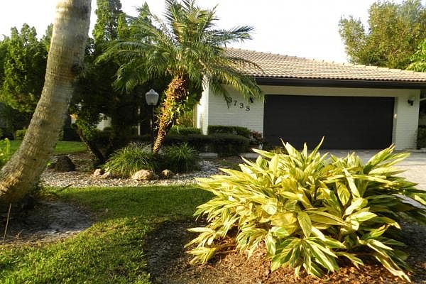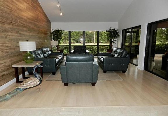 Completely renovated, 3 BR, 3 BA (all en suite), cathedral ceiling, bright, private on all sides, directly across from community pool with expansive golf course view in the back and lake view in the front. Large screened in lanai (half covered), new Spanish tile roof, brick paver driveway, finished garage. Great layout for entertaining inside or outside.