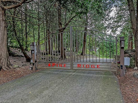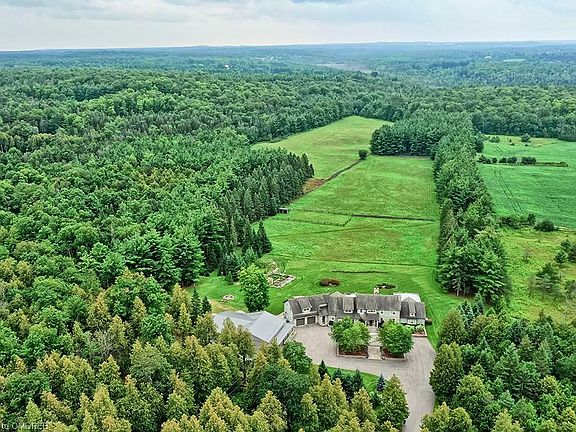 Tucked into a long wooded laneway, lies a truly magnificent rural paradise. No need for Muskoka when youve got this slice of heaven! Driving up to this stunning wood-sided and stone custom-built home evokes a simpler time. This vast two-story winged home was fully rebuilt in 2006 and is an engineering masterpiece with its vaulted ceilings and semi open concept layout. The floor plan flows seamlessly from the principal bedroom wing through to the heart of the home, the family room and gourmet kitchen. Enjoy the natural stone fireplace while gazing out at the beautifully landscaped vistas that the backyard paradise presents. The main level layout allows for easy transition to the outside onto the customized rear screened patio deck. Lovingly created this vast stone patio allows for four seasons of enjoyment with its automated screens, it stretches from the kitchen through to the principal bedroom wing. The generous dining room enjoys the glow of one side of the stone fireplace and is semi open to the kitchen and Great room. The perfect home office allows the ideal work from home environment. On one of two upper loft second level areas, another two bedrooms/bathrooms await. The second lofted area has a full home theatre. Over 8,178 sq ft of total luxury living with no expense spared. Fully finished lower level offers two further bedrooms, plus huge recreation room. If youre not impressed enough already, your breath will be taken away with the extensive and fully landscaped property of almost 34 acres! The back stone patio with its automated screens stretches from one end of the home to the other. Meandering natural stone paths lead to the opening of several curated paths through the trees. Continue to stroll over to the heated custom-built garage/barn with its Muskoka appeal. It acts as a secondary garage for special cars, boats, trailers or multiple tractors. This home will become a destination and a source of peace and comfort for years to come.