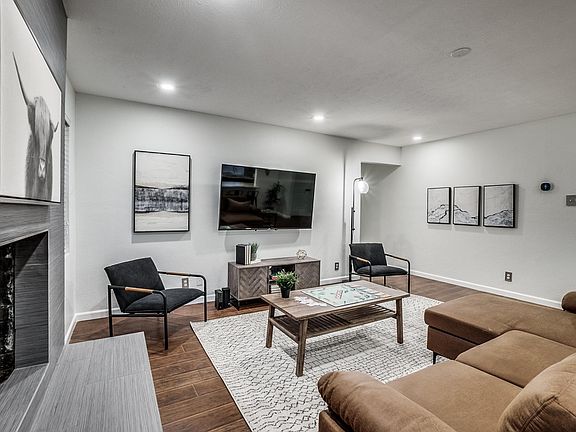 Open living area with fireplace, sectional seating, and 70" Smart TV