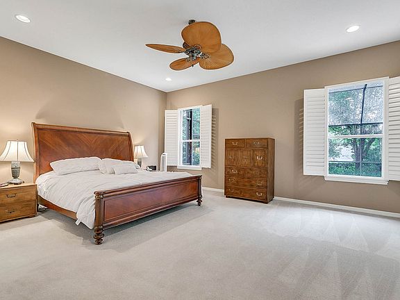 Welcome to OakCreste, a private, gated street of 22 custom homes. This single-story brick home has 5 large bedrooms in a split floor plan. There is a great bedroom with private bathroom, perfect for Grandparents; two large bedrooms that share a bathroom; a bedroom with glass french doors, perfect for office, playroom or nursery; and a second story private loft over the garage, complete with huge closet and full en-suite bathroom. The Master suite has a closet system, plantation shutters and deep soaking hydro spa bathtub. Create your "Dream Spa" in the master bathroom. Sparkling pool views through sliding pocket glass doors bring the outside in. Screened 13x30 solar-heated pool and spa are perfect year round. Luxury features include French pattern tile, cathedral ceilings, gourmet kitchen updated 2014, new roof 2014, whole house water softener and filtration system, and extra storage space throughout. Custom Mahogany built-in cabinetry, designer granite countertop, cozy wood-burning fireplace, a 3-car garage with oversized paver driveway. Fenced low maintenance private backyard is perfect for pets. Quick closing available.