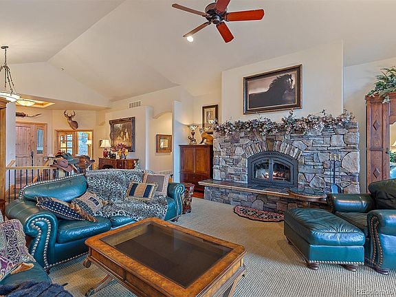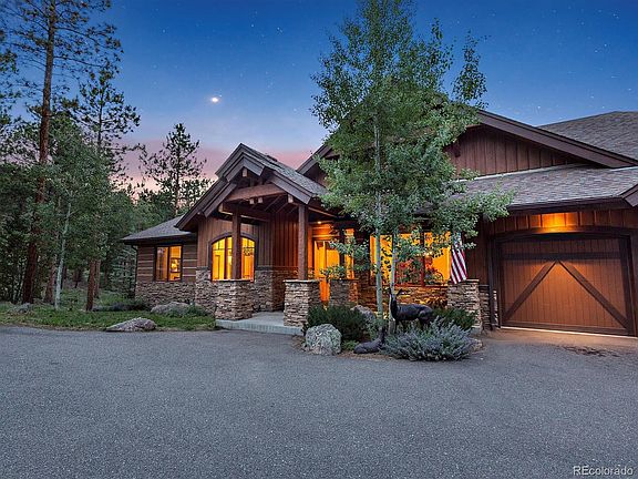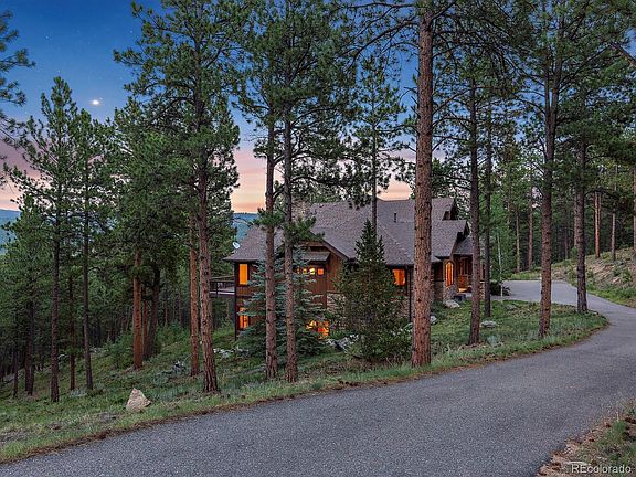 Magnificent, custom built, multi-gabled mountain contemporary set on almost 6 acres, located in the highly desirable, secluded Douglass Ranch. Enjoy the incredible views of nearby mountains from the main-level kitchen or its adjoining massive family-room, master bedroom, or the expansive, covered mahogany deck. Full glass doors allow deck access from any of the three gorgeous rooms. The family-room boasts a high-cathedral ceiling and a low-emission, environmental-friendly Xtrodinair Wood burning fireplace. Gorgeous 5" plank, cherrywood hardwood floors throughout most of the main level. 10-foot-high ceilings throughout upper level for a true luxury feel. The kitchen includes a walk-in pantry, beautiful marble countertops, island with gas burners, and nearby butler station. Master suite boasts an adjoining, large 4-piece bathroom featuring marble countertops, large jetted tub and stone floors, a massive walk-in master closet with dressing table. Upper level also includes large dining room, a home office, sitting room, laundry room, and stunning entry with a mountain view. Lower level enjoys high nine-foot ceilings, large family room with walk-out, full bar, dishwasher and cabinets, two large bedrooms, 5-piece bath, hobby room, two large storage rooms, with windows everywhere, and another stunning, custom built Xtrodinair Wood burning fireplace. The exterior boasts huge hand-hewn beams and siding to give the home a classic mountain luxury look. Three car garage with South-facing, level, paved driveway. Concrete patio for a spa or outdoor grilling. Excellent high-speed internet allows you to office and work from home. All exterior walls are 6 inch thick and all windows are no-maintenance, double-paneled. Douglass Ranch is the most desirable neighborhood in Pine, Colorado with all paved and county-maintained roads throughout, quick access to Hwy 285 for a 30 minute commute to Denver, 45 minutes to downtown Denver. Make plans for your private showing now!