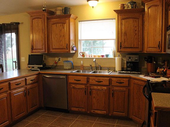 BETTER THAN NEW 3BR one level home in suburban development has NO ACCESS STAIRS. Vaulted and tray ceilings, bullnose walls, carpeted bedrooms, ceramic tile and water resistant Pecan Swirl Praline plank flooring. Walk-in closets in all 3 bedrooms. Security system and invisible fence. Nearly-new dishwasher. Custom storage cabinetry added to bathrooms. 2017 Updates: new gutters, upgraded insulated vinyl siding, high end Malarkey rubber-base 30-year asphalt shingles, and roof-mounted, thermostatically controlled power attic ventilator. Twister Safe 6x5 storm shelter, pull-down attic access stairs(pt. decked) and storage shelving in garage. Patio and driveway have stamped concrete and professional landscaping surrounds the level lush yard. Neighboring lots on both sides already privacy fence