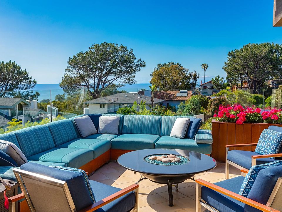Classic California coastal ocean views and an incomparable location mix exquisitely in this stunning Del Mar home. Step into this 3,536 square foot, 4+ bedroom, 4.5 bathroom charmer, via a private bridge walkway, entering a huge light-filled, ocean view dream home. Gleaming wood floors and a coordinating wood ceiling in the great room welcome you with natural and recessed lighting abundantly throughout the main level. A large wet bar, wall-mounted gas fireplace, custom built-ins, pre-wired surround sound speakers and 11 brand new skylights enhance the glowing feel of this superb living area. Walk out through the new glass sliders, complete with Shade Store electric shades, to the large lounging and entertainment patio, featuring panoramic ocean views, a fire pit seating area and separate dining area with built-in gas BBQ. The well-appointed kitchen is equipped with top of the line appliances, including a new Wolf oven, an eat-in dining area, as well as countertop seating for four, all looking out to the Pacific. The roomy primary suite includes a huge walk-in closet with California Closet built-ins, your own private balcony, a massive bathroom with double vanities, sunken tub, separate glassed-in shower and ample natural light. An office/optional room continue the natural light/airy vibe with spectacular ocean views to the North and a separated modern powder room round out this level. See supplement...